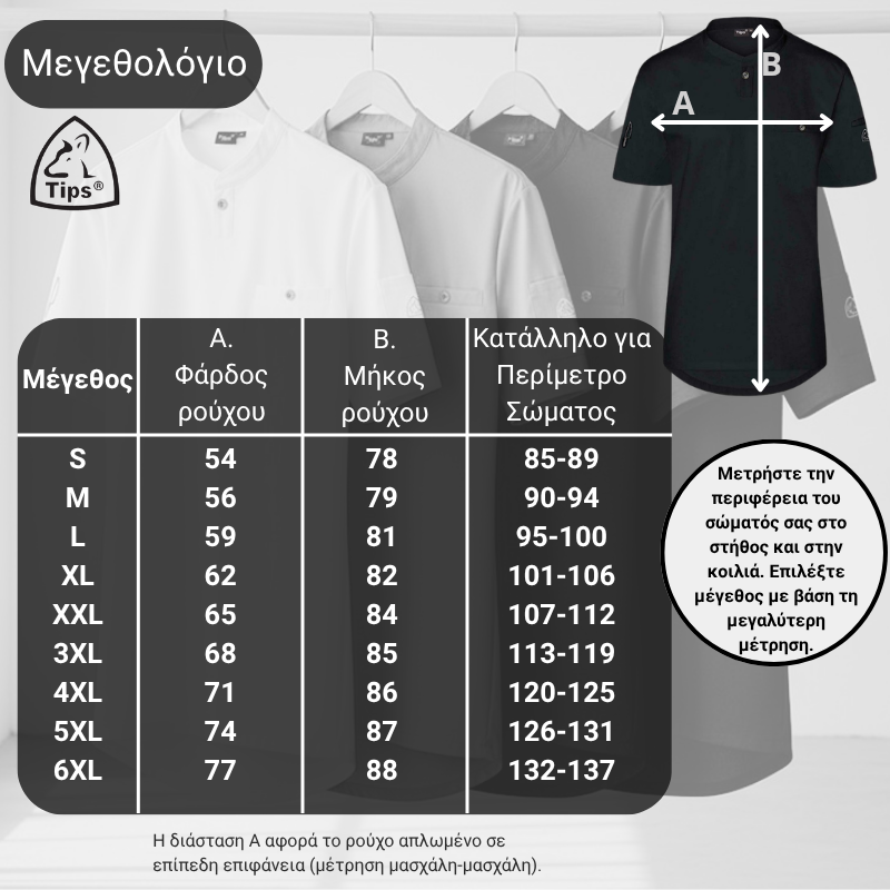 Σύγκριση με δικό σας ρούχο: Απλώστε ένα δικό σας άνετο σακάκι ή πουκάμισο σε ένα τραπέζι, μετρήστε την απόσταση από μασχάλη σε μασχάλη και συγκρίνετε με τη Διάσταση Α του πίνακα.