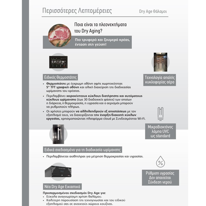 Νέα Dry Age Εικαστικά Προσαρµοσµένος σχεδιασµός Dry Age για: • Εύκολα αναγνωρίσιµη χρήση θαλάµου. • Καλύτερη παρουσίαση της τεχνογνωσίας και του ειδικού εξοπλισµού σας σε ανοιχτούς χώρους κουζίνας.