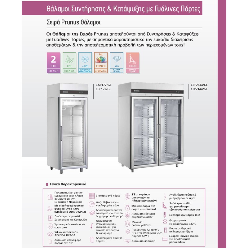 Τα Μοντέλα Θαλάμων της Σειράς Prunus αποτελούν τα απόλυτα εργαλεία διαχείρισης και προβολής αποθεμάτων, συμβάλλοντας στην ομαλότερη λειτουργία τόσο της επαγγελματικής κουζίνας σας όσο και της επιχείρησής σας συνολικά. Τα προϊόντα της Σειράς Prunus είναι ιδανικά για ανοικτές κουζίνες, καθώς και για γρήγορο και εύκολο έλεγχο αποθεμάτων. Με αυτά τα ψυγεία δεν θα ξεμείνετε ποτέ από υλικά! Ακόμη, είναι άκρως κατάλληλα για mini-markets και περίπτερα, καθώς σας απελευθερώνουν από περιττές δεσμεύσεις.