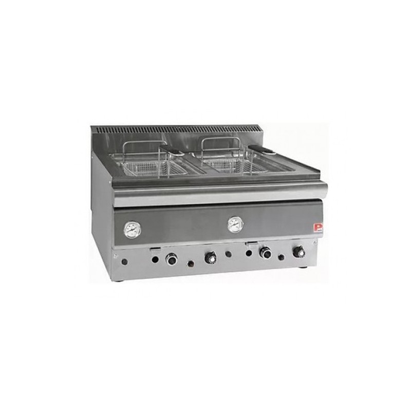 Φριτέζα αερίου με δύο κάδους 8+8 lt, δύο θερμοστάτες και δύο θερμόμετρα.