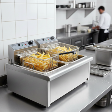 Φριτέζα αερίου με δύο κάδους 8+8 lt, δύο θερμοστάτες και δύο θερμόμετρα.