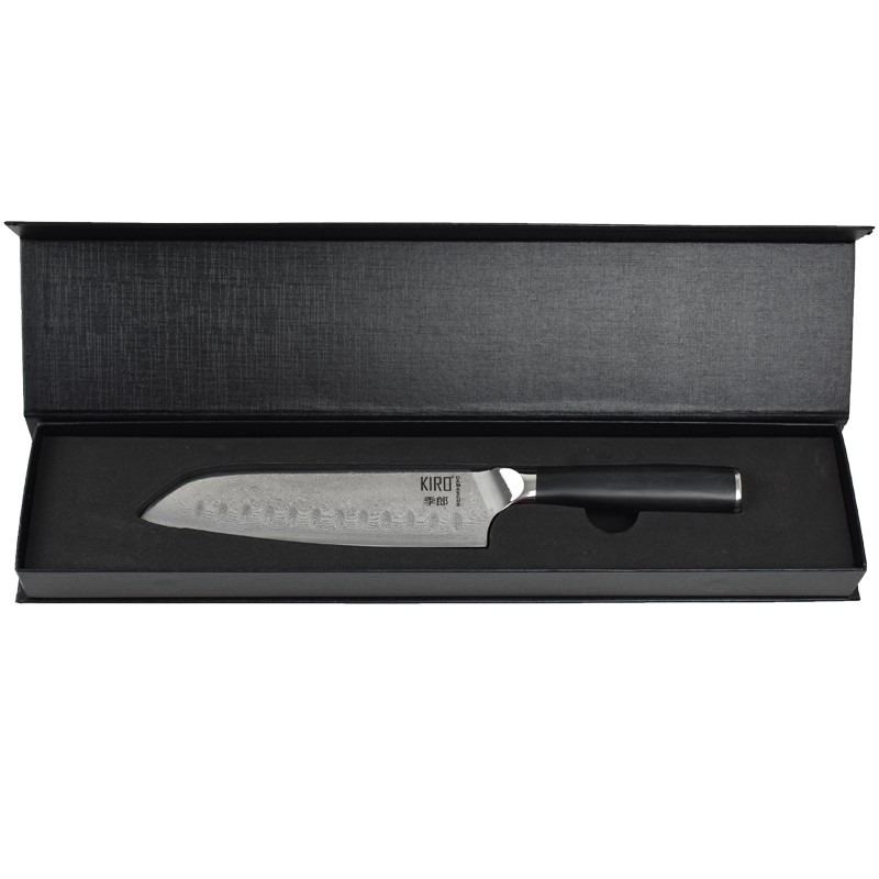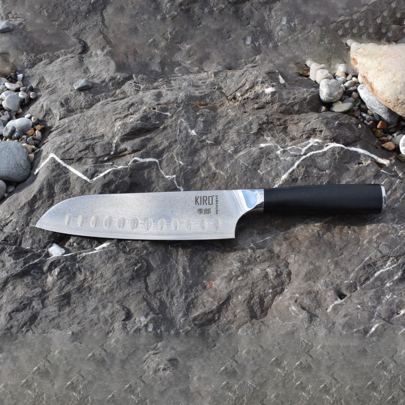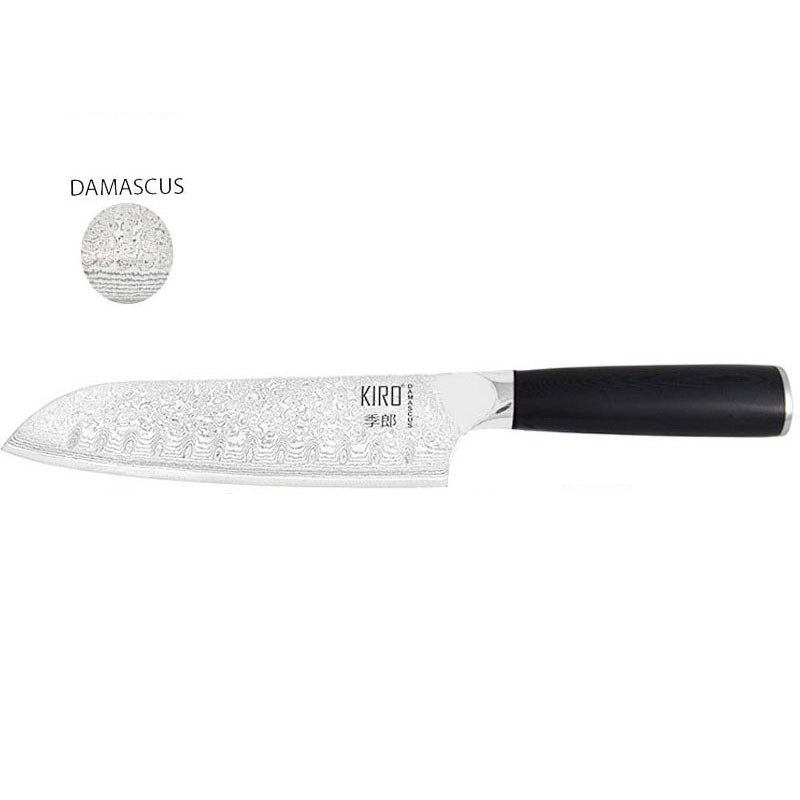 Το μαχαίρι - maxairi Santoku Damascus της σειράς Kazan της Kiro, αποτελεί μια εξαιρετική επιλογή καθώς η λάμα του είναι από δαμασκηνό ανοξείδωτο ατσάλι, φημισμένο για την αιχμηρότητα και ανθεκτικότητά του, και λαβή G10 από fiberglass υψηλής πίεσης και αντοχής.