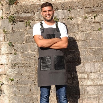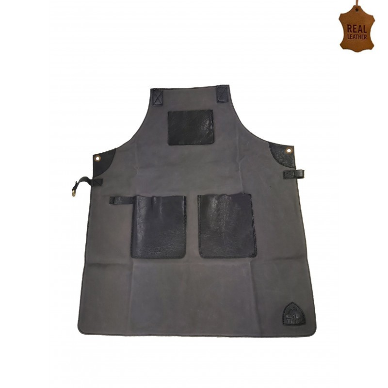 Ποδιά με δέσιμο στο λαιμό, ολόσωμη, καμβάς γκρι χρώμα με 100% δερμάτινες μαύρες τσέπες
