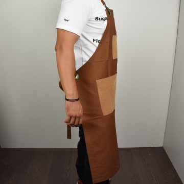 Ποδιά με τιράντες ολόσωμη, καμβάς γκρι χρώμα με 100% δερμάτινες μαύρες τσέπες